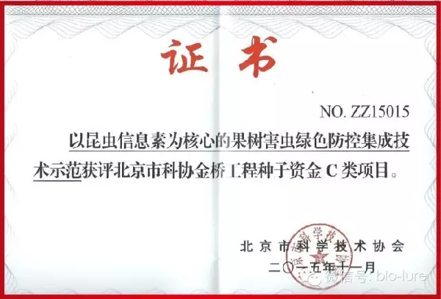 【研發(fā)】2015 年11 月,公司開展的“以昆蟲信息素為核心的果樹害蟲綠色防控集成技術(shù)示范”項目獲北京市金橋工程種子資金支持。