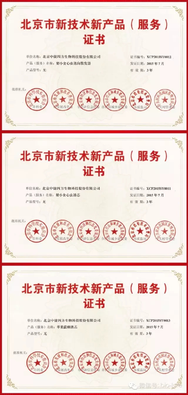 【產(chǎn)品】2015年12月,公司米面蛾(粘蟲板)誘捕器、斜紋夜蛾誘芯、甜菜夜蛾誘芯、金紋細蛾誘芯、綠盲蝽誘芯獲北京市新技術(shù)新產(chǎn)品認定,批準機關(guān)北京市科委、市發(fā)改委、市經(jīng)信委、市住建委、市質(zhì)監(jiān)局、中關(guān)村管委會。
